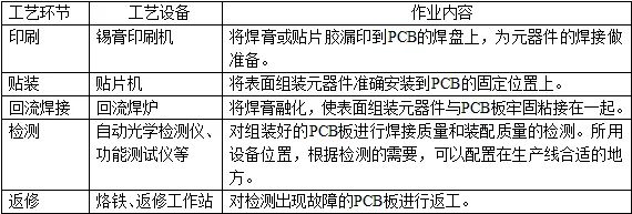 SMT生产工艺一般包括焊膏印刷、贴片、回流焊、检测等四个环节。SMT生产工艺按元器件的装贴方式可以分为纯SMT装联